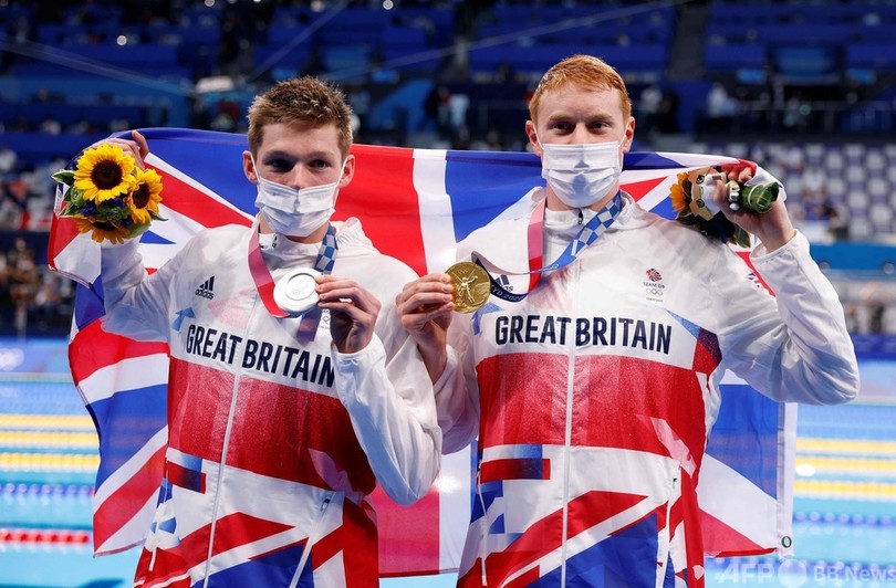 男子200メートル自由形では、英国勢がワンツーフィニッシュ。残り50メートルで逆転に成功したトム・ディーン(Tom Dean)が1分44秒22の英国新記録で優勝し、ダンカン・スコット(Duncan Scott)が銀メダル、ブラジルのフェルナンド・シェフェル(Fernando Scheffer)が銅メダルを獲得した。(c)AFP/Martin PARRY