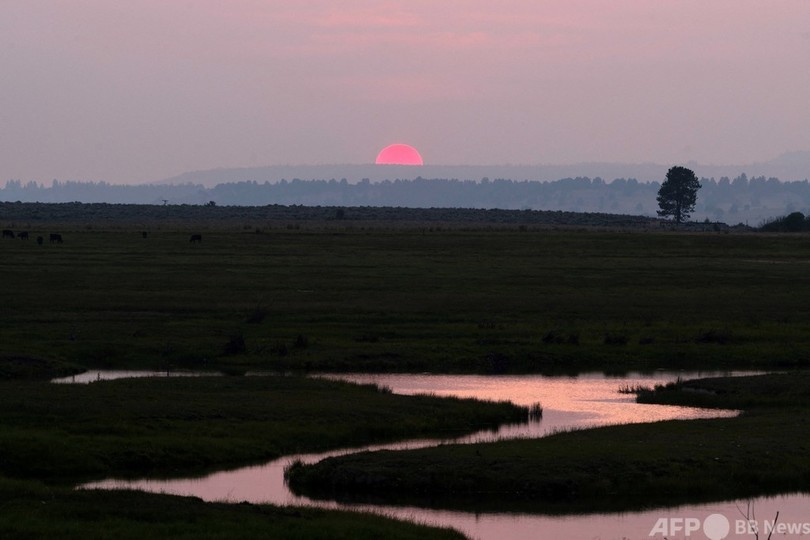 【今日の1枚】山火事の煙にかすむ赤い夕日、米オレゴン州