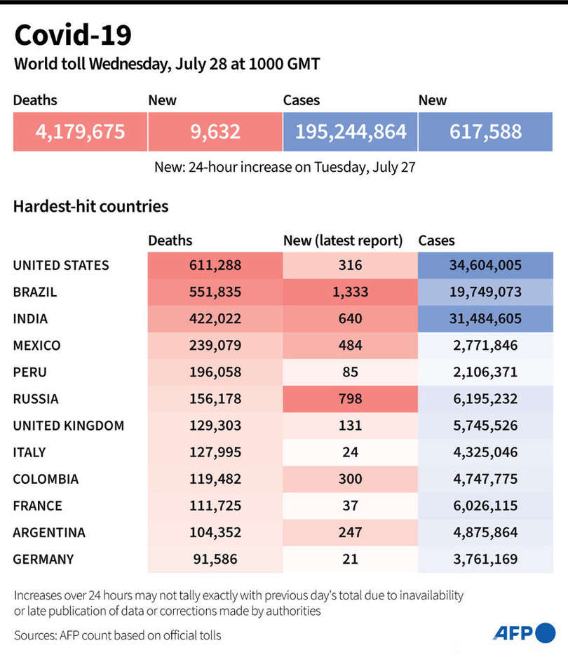 【7月29日 AFP】AFPが各国当局の発表に基づき日本時間28日午後7時にまとめた統計によると、世界の新型コロナウイルスによる死者数は417万9675人に増加した。
