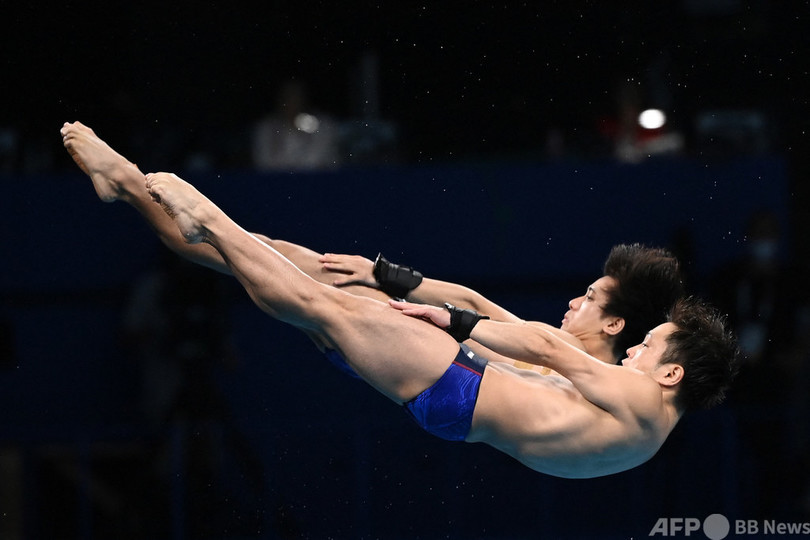【8月3日 AFP】東京五輪男子シンクロ板飛び込み決勝。水面下でカメラが捉えた日本の坂井丞(Sho Sakai)と寺内健(Ken Terauchi)のペア。東京アクアティクスセンター(Tokyo Aquatics Centre)で。(c)AFP
