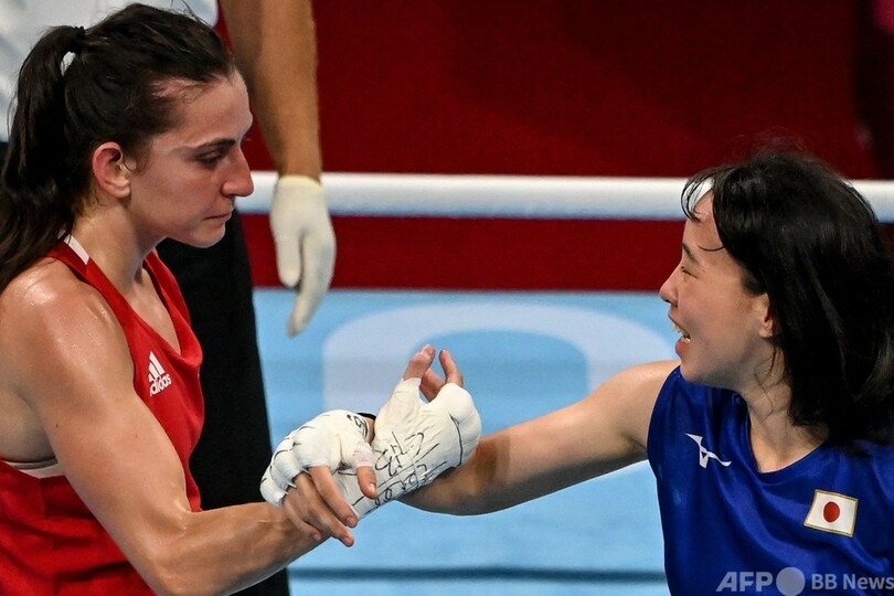【7月31日 AFPBB News】東京五輪は31日、ボクシング女子フェザー級準決勝が行われ、入江聖奈(Sena Irie)が判定でカリス・アーティングストール(Karriss Artingstall、英国)に勝利し、決勝に進出した。(c)AFPBB News