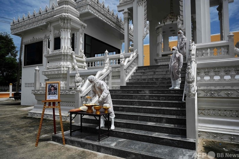 【8月2日 AFP】タイでは、新型コロナウイルスの感染者が急増する中、黄衣の上から防護服を着た僧侶らが、酸素ボンベを運び、鼻から検体を採取し、火葬場に遺体を運ぶのを手伝っている。