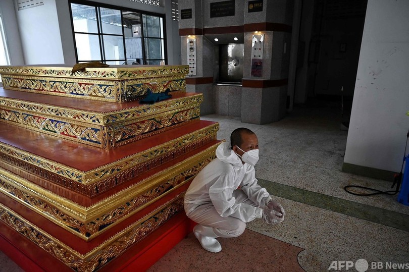 【8月2日 AFP】タイでは、新型コロナウイルスの感染者が急増する中、黄衣の上から防護服を着た僧侶らが、酸素ボンベを運び、鼻から検体を採取し、火葬場に遺体を運ぶのを手伝っている。