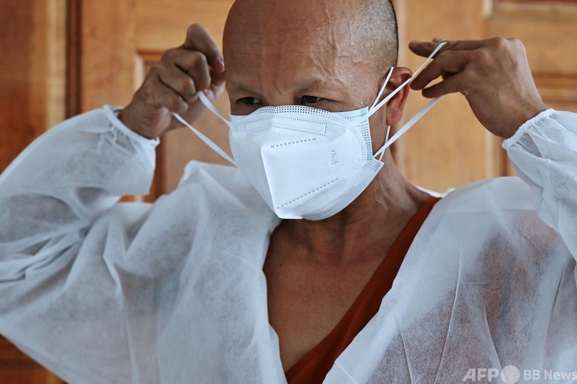 【8月2日 AFP】タイでは、新型コロナウイルスの感染者が急増する中、黄衣の上から防護服を着た僧侶らが、酸素ボンベを運び、鼻から検体を採取し、火葬場に遺体を運ぶのを手伝っている。