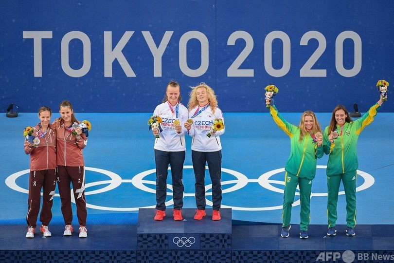 【8月1日 AFP】東京五輪は1日、テニス女子ダブルス決勝が行われ、チェコの大会第1シード、バルボラ・クレイチコバ(Barbora Krejcikova)/カテリーナ・シニアコバ(Katerina Siniakova)組はスイスのベリンダ・ベンチッチ(Belinda Bencic)/ヴィクトリヤ・ゴルビッチ(Viktorija Golubic)組を7-5、6-1で下し、金メダルを獲得した。