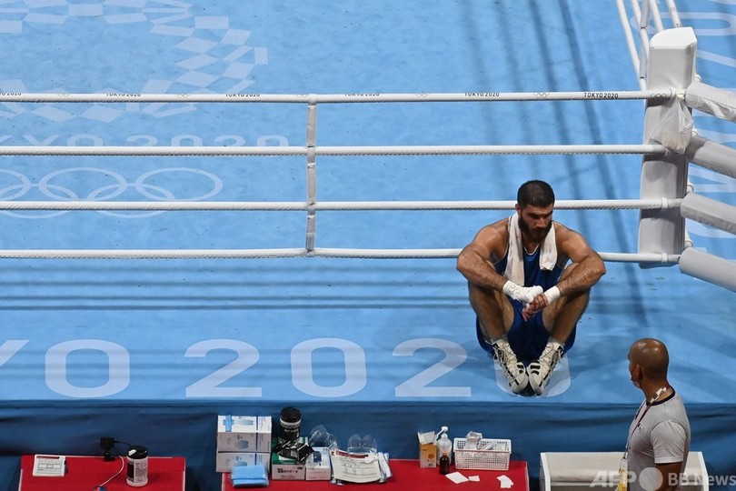 【8月1日 AFP】1日に行われた東京五輪、ボクシング男子スーパーヘビー級準々決勝の試合で、失格になったフランスの選手が「不当」な判定に抗議し、リングサイドで座り込んだ。