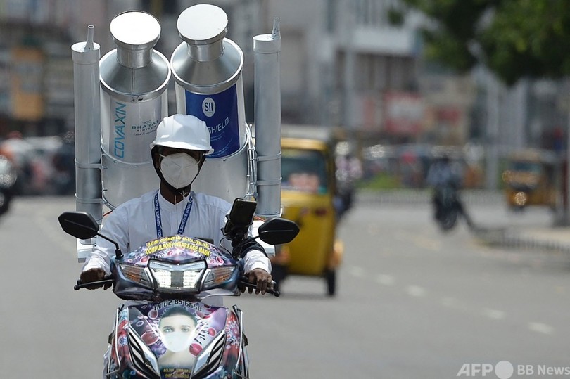 【8月3日 AFP】インド南部チェンナイ(Chennai)で2日、国内で製造されている新型コロナウイルスワクチン「コビシールド(Covishield)」と「コバクシン(Covaxin)」の瓶の模型をスクーターの後ろに載せて、街を走る男性の姿がみられた。ワクチン接種呼び掛けキャンペーンの一環。(c)AFP
