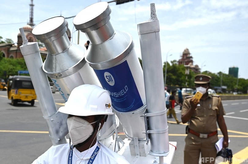 【8月3日 AFP】インド南部チェンナイ(Chennai)で2日、国内で製造されている新型コロナウイルスワクチン「コビシールド(Covishield)」と「コバクシン(Covaxin)」の瓶の模型をスクーターの後ろに載せて、街を走る男性の姿がみられた。ワクチン接種呼び掛けキャンペーンの一環。(c)AFP