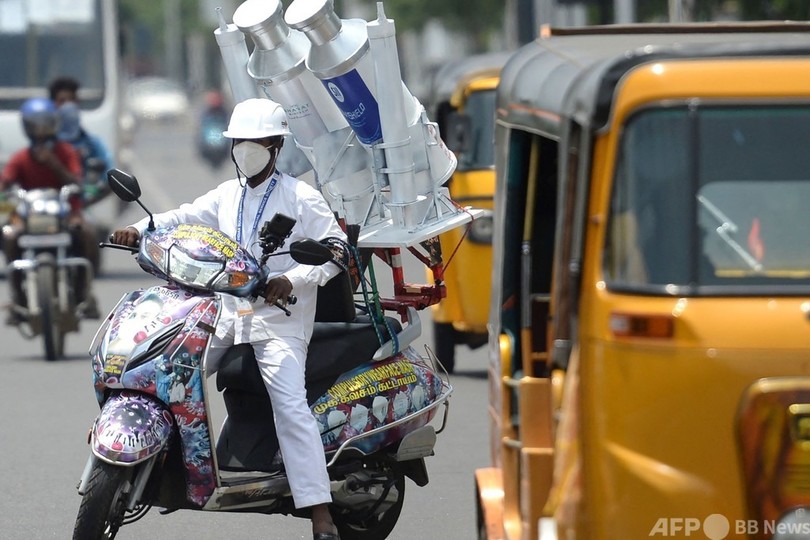 【8月3日 AFP】インド南部チェンナイ(Chennai)で2日、国内で製造されている新型コロナウイルスワクチン「コビシールド(Covishield)」と「コバクシン(Covaxin)」の瓶の模型をスクーターの後ろに載せて、街を走る男性の姿がみられた。ワクチン接種呼び掛けキャンペーンの一環。(c)AFP