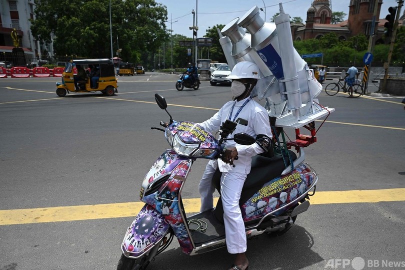 【8月3日 AFP】インド南部チェンナイ(Chennai)で2日、国内で製造されている新型コロナウイルスワクチン「コビシールド(Covishield)」と「コバクシン(Covaxin)」の瓶の模型をスクーターの後ろに載せて、街を走る男性の姿がみられた。ワクチン接種呼び掛けキャンペーンの一環。(c)AFP