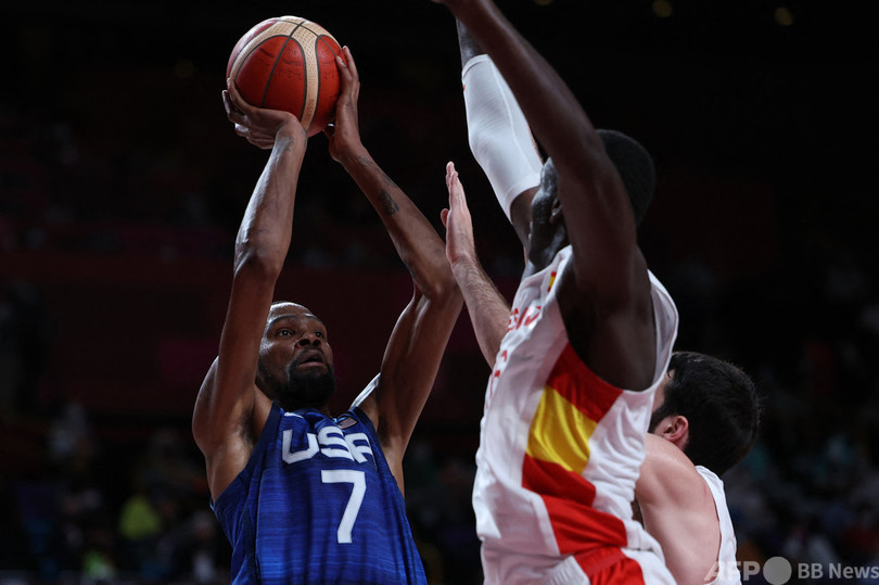 世界ランキングの1位と2位による一戦で、米国はプロバスケットボール(NBA)のブルックリン・ネッツ(Brooklyn Nets)に所属するケビン・デュラント(Kevin Durant)が29得点4アシスト、ボストン・セルティックス(Boston Celtics)でプレーするジェイソン・テイタム(Jayson Tatum)が13得点をマークし、スペインのリッキー・ルビオ(Ricky Rubio)がたたき出した38得点は無に帰した。