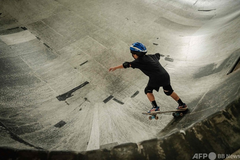【8月8日 AFP】北海道札幌市の施設「Hotbowl Skate Park(ホットボウル・スケート・パーク)」でスケートボードの練習をする子どもたち。ここは東京五輪のスケートボード女子パークで銀メダルを獲得した開心那(Kokona Hiraki、12)の練習拠点。(c)AFP