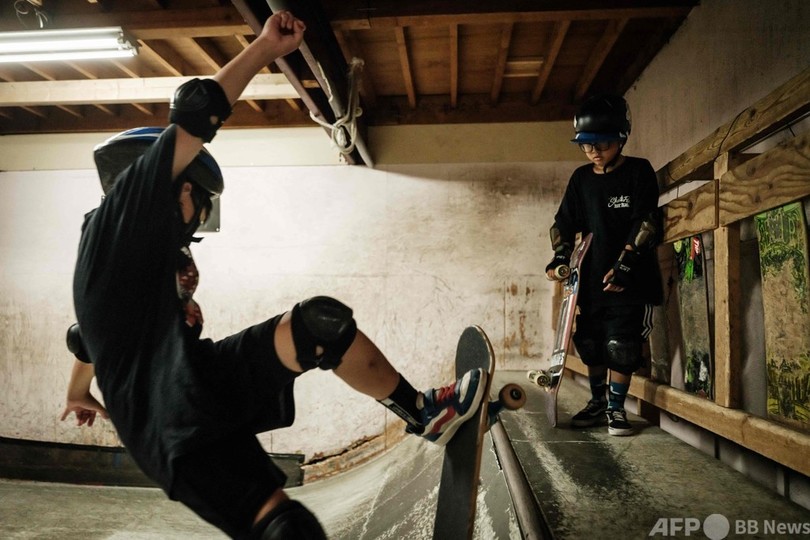 【8月8日 AFP】北海道札幌市の施設「Hotbowl Skate Park(ホットボウル・スケート・パーク)」でスケートボードの練習をする子どもたち。ここは東京五輪のスケートボード女子パークで銀メダルを獲得した開心那(Kokona Hiraki、12)の練習拠点。(c)AFP