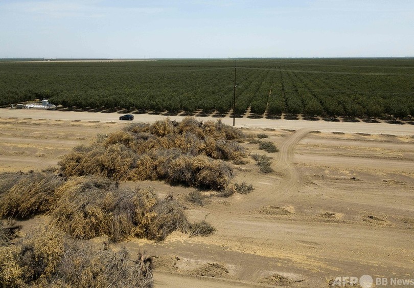 米カリフォルニア州のアーモンド農園、干ばつと給水制限で収穫前に根こそぎ廃棄