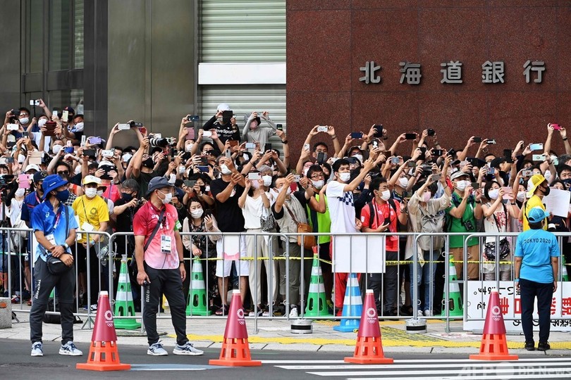 新型コロナウイルス感染症(COVID-19)対策として、東京などでは無観客で行われている五輪だが、札幌で行われたこの日のレースでは、沿道に多くのファンが詰めかけた。(c)AFP