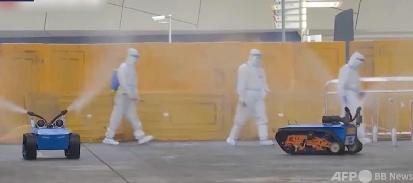 「ミニタンク」が噴出する消毒剤は粒径が100マイクロメートル以下ととても細かく、7万平方メートルの消毒殺菌作業を1時間以内に終えることができます。これは20人の作業量に相当するとのことです。現在、封鎖エリアや隔離用ホテル、PCR検査所などで活躍しています。(c)CGTN Japanese/AFPBB News