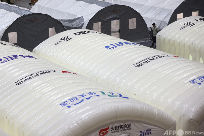 実験室は面積が8000平方メートルに及び、ハード型エアドームテント12基とソフト型15基が設置されている。会場には全自動分別処理システムや自動核酸抽出装置を備えており、検査効率の向上と検査スタッフの感染リスク低減を同時に図る。10人分の検体をプール検査する方式を採用すると、1日あたりのPCR検査能力は最大200万人分に達する。(c)CNS/JCM/AFPBB News
