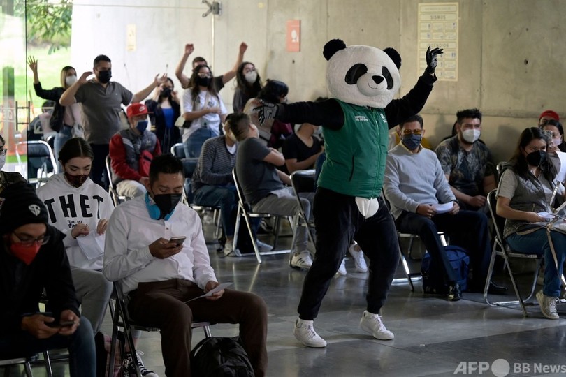 【8月11日 AFP】新型コロナウイルスの流行第3波に見舞われているメキシコの首都メキシコ市で10日、ワクチン接種会場にパンダの「パンデミオ(Pandemio)」の着ぐるみを着た地元政府職員が登場し、英アストラゼネカ(AstraZeneca)製ワクチンの1回目の接種を終えた人たちをエクササイズで楽しませた。(c)AFP