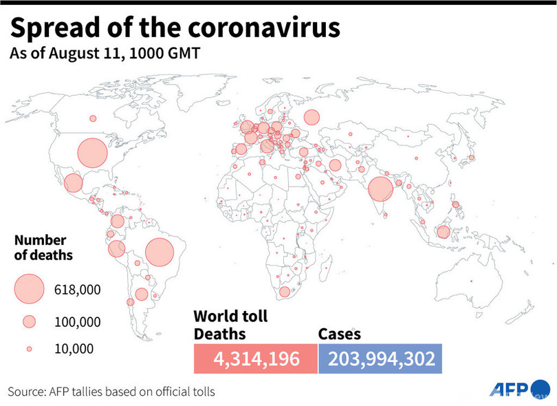 【8月11日 AFP】AFPが各国当局の発表に基づき日本時間11日午後7時にまとめた統計によると、世界の新型コロナウイルスによる死者数は431万4196人に増加した。