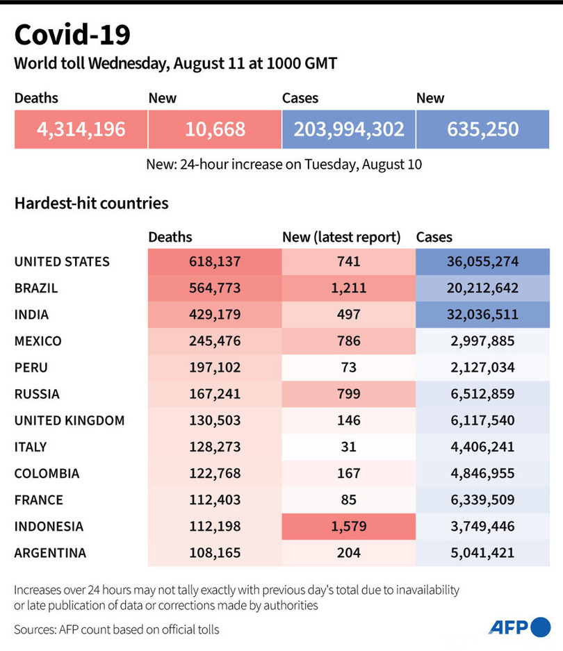【8月11日 AFP】AFPが各国当局の発表に基づき日本時間11日午後7時にまとめた統計によると、世界の新型コロナウイルスによる死者数は431万4196人に増加した。