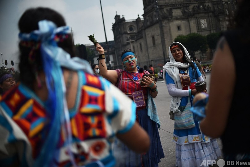アステカ帝国の中心地だったメキシコ市のソカロ(Zocalo)広場で開かれた式典には、メキシコ、カナダ、米国の先住民の代表者と、アステカ帝国の皇帝モクテスマ2世(Moctezuma II)の子孫も出席した。