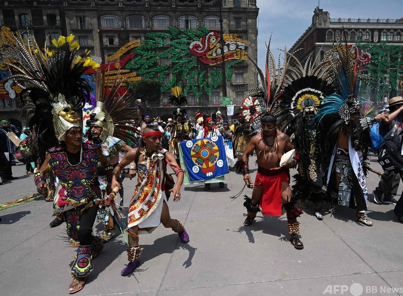アステカ帝国の中心地だったメキシコ市のソカロ(Zocalo)広場で開かれた式典には、メキシコ、カナダ、米国の先住民の代表者と、アステカ帝国の皇帝モクテスマ2世(Moctezuma II)の子孫も出席した。