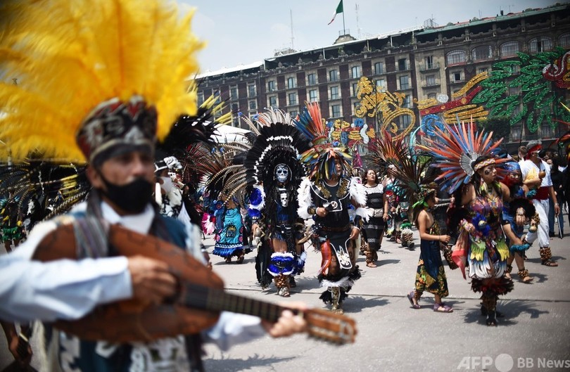 アステカ帝国の中心地だったメキシコ市のソカロ(Zocalo)広場で開かれた式典には、メキシコ、カナダ、米国の先住民の代表者と、アステカ帝国の皇帝モクテスマ2世(Moctezuma II)の子孫も出席した。