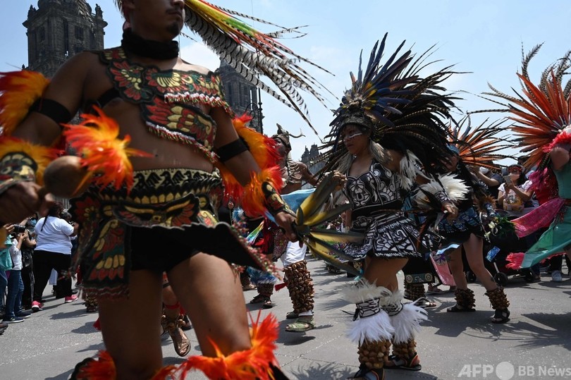 アステカ帝国の中心地だったメキシコ市のソカロ(Zocalo)広場で開かれた式典には、メキシコ、カナダ、米国の先住民の代表者と、アステカ帝国の皇帝モクテスマ2世(Moctezuma II)の子孫も出席した。