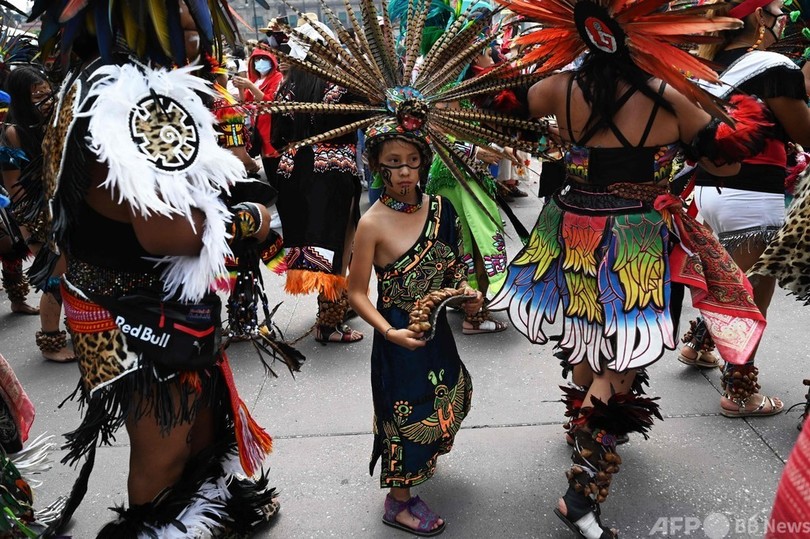アステカ帝国の中心地だったメキシコ市のソカロ(Zocalo)広場で開かれた式典には、メキシコ、カナダ、米国の先住民の代表者と、アステカ帝国の皇帝モクテスマ2世(Moctezuma II)の子孫も出席した。