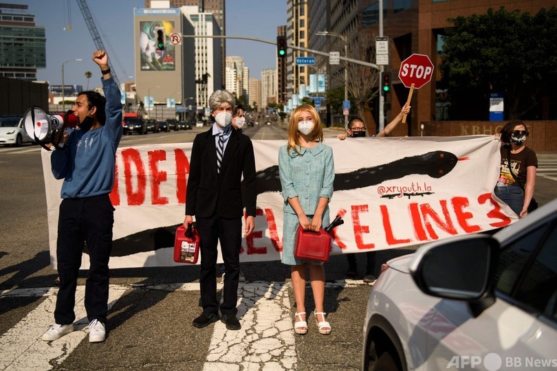 バイデン夫妻に扮して気候変動とパイプライン計画に抗議、米LA