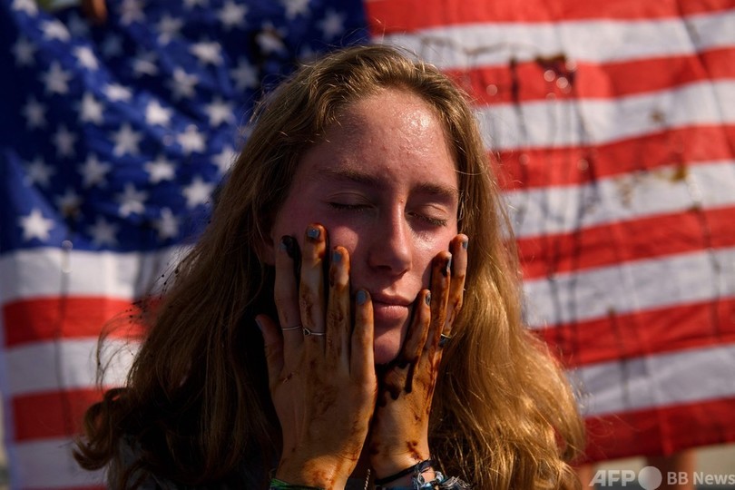 【8月14日 AFP】米ロサンゼルスの連邦政府庁舎前で13日、気候変動の危機を訴える団体「絶滅への反逆(Extinction Rebellion)」のグループ「XRユース・ロサンゼルス(XR Youth Los Angeles)」の活動家らが気候変動と原油パイプライン計画「ライン3(Line 3)」に抗議するデモを行った。