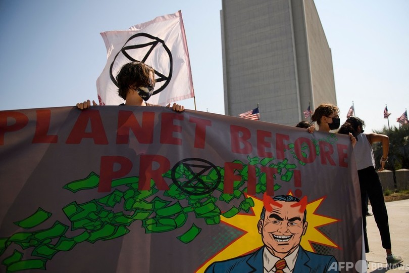 【8月14日 AFP】米ロサンゼルスの連邦政府庁舎前で13日、気候変動の危機を訴える団体「絶滅への反逆(Extinction Rebellion)」のグループ「XRユース・ロサンゼルス(XR Youth Los Angeles)」の活動家らが気候変動と原油パイプライン計画「ライン3(Line 3)」に抗議するデモを行った。