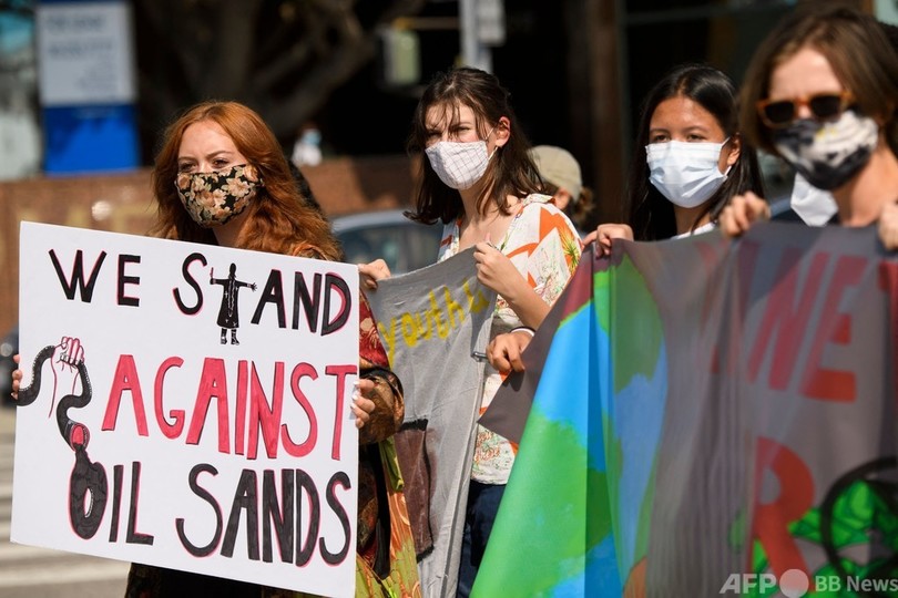 【8月14日 AFP】米ロサンゼルスの連邦政府庁舎前で13日、気候変動の危機を訴える団体「絶滅への反逆(Extinction Rebellion)」のグループ「XRユース・ロサンゼルス(XR Youth Los Angeles)」の活動家らが気候変動と原油パイプライン計画「ライン3(Line 3)」に抗議するデモを行った。