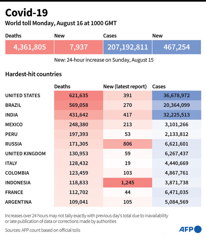 【8月17日 AFP】AFPが各国当局の発表に基づき日本時間16日午後7時にまとめた統計によると、世界の新型コロナウイルスによる死者数は436万1805人に増加した。