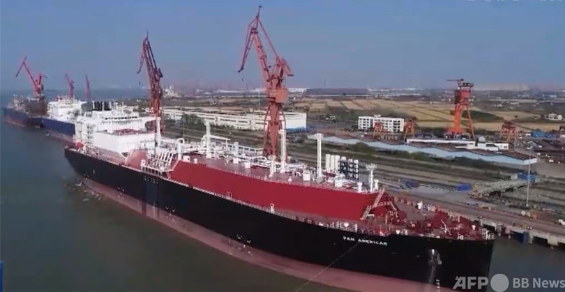 現在、環渤海、長江口から珠江口に至るまで、中国はすでに3大造船基地を形成しています。新船受注の増加は造船所の生産に繁忙をもたらしており、上海の長興島では16のふ頭に建造中の大型船が並び、進度の違いこそあれ整然としています。(c)CGTN Japanese/AFPBB News
