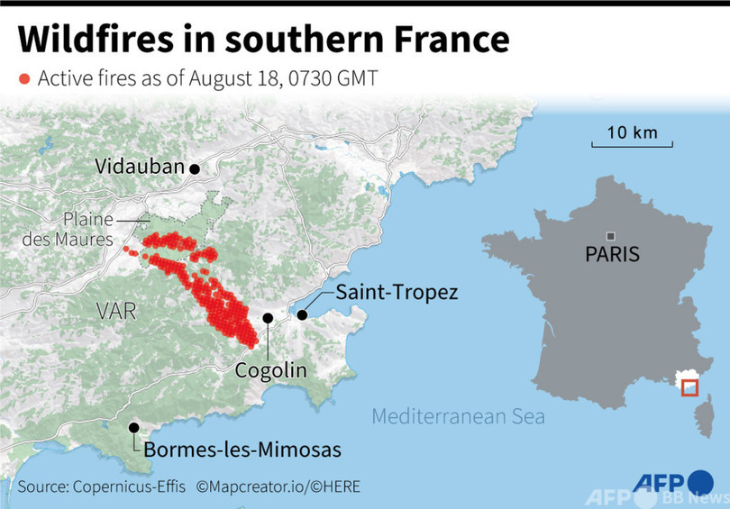 【8月18日 AFP】フランス南部コート・ダジュール(French Riviera、フレンチリビエラ)の高級リゾート、サントロペ(Saint-Tropez)近郊で同国では今季最大規模の山火事が続いており、3日目となった18日も多数の消防隊員が消火活動に追われた。1人が死亡し、住民や観光客約7000人が避難を余儀なくされた。