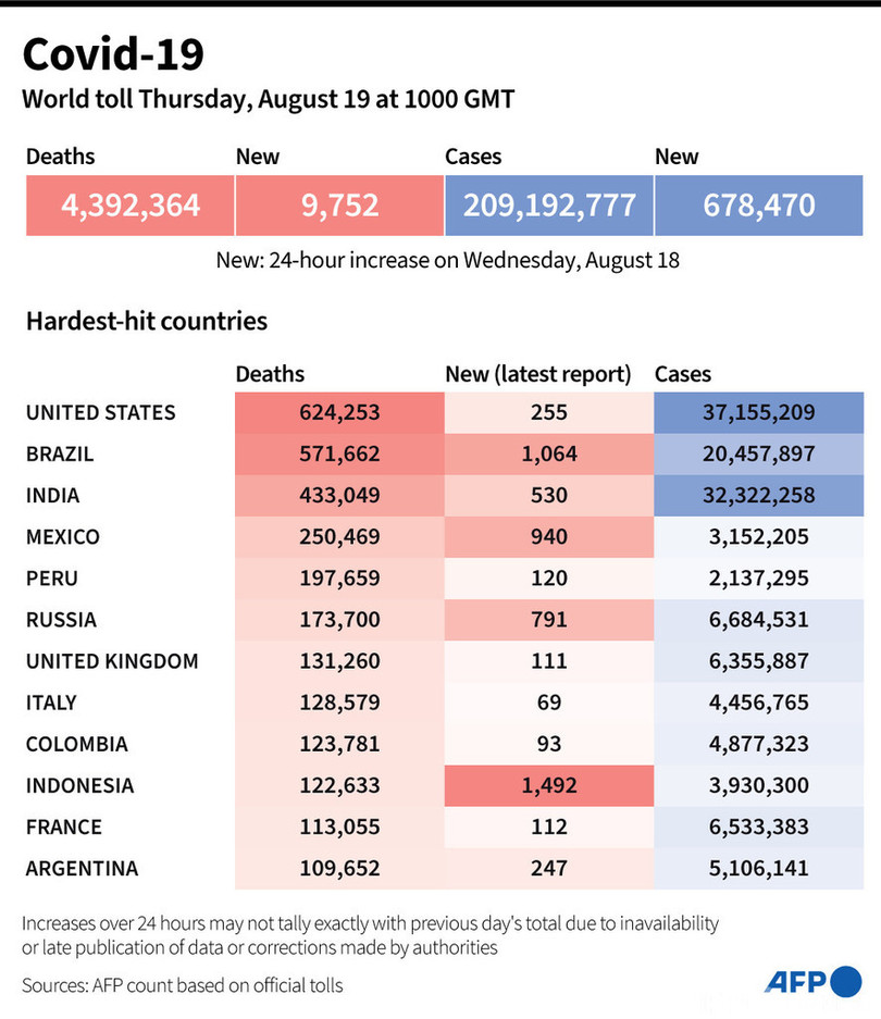 【8月19日 AFP】AFPが各国当局の発表に基づき日本時間19日午後7時にまとめた統計によると、世界の新型コロナウイルスによる死者数は439万2364人に増加した。