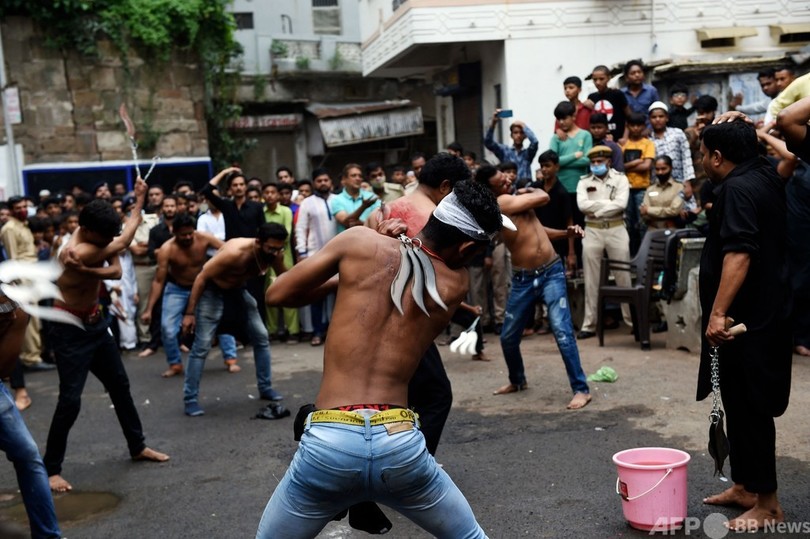 【8月21日 AFP】インド西部アーメダバード(Ahmedabad)で20日、イスラム教の預言者ムハンマド(Prophet Mohammed)の孫イマーム・フセイン(Imam Hussein)の死を悼む同教シーア派(Shiite)の儀式が行われた。信徒らは鎖に付けた刃物を自分の背中にむち打ったり、頭に刃物を当てたりした。(c)AFP