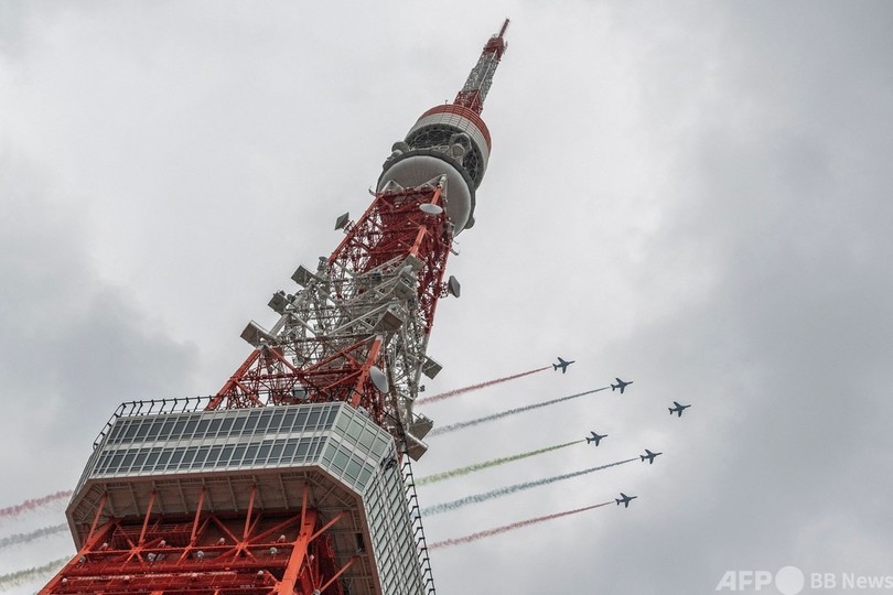 【8月24日 AFP】東京パラリンピックの開会式を控えた24日、航空自衛隊のアクロバット飛行チーム「ブルーインパルス(Blue Impulse)」が東京上空を飛行した。