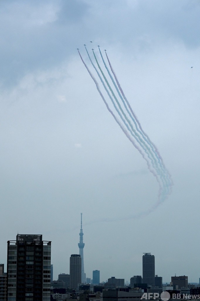 【8月24日 AFP】東京パラリンピックの開会式を控えた24日、航空自衛隊のアクロバット飛行チーム「ブルーインパルス(Blue Impulse)」が東京上空を飛行した。