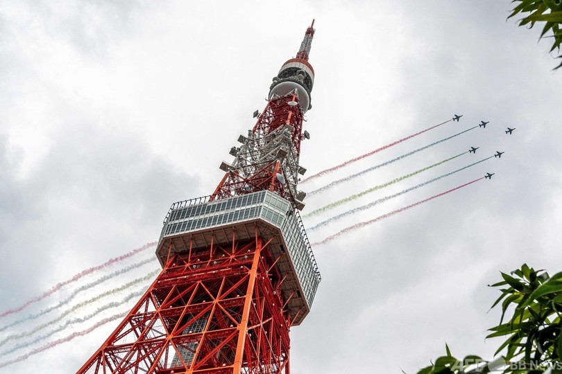 【8月24日 AFP】東京パラリンピックの開会式を控えた24日、航空自衛隊のアクロバット飛行チーム「ブルーインパルス(Blue Impulse)」が東京上空を飛行した。