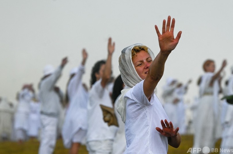 標高2100メートルにある「リラの七つ湖(Seven Rila Lakes)」周辺で、白い服を着た人々が、歌声とバイオリンの奏でる音楽に合わせ「パネウリスミー(paneurhythmy)」という瞑想(めいそう)的なダンスを1時間以上続ける。(c)AFP