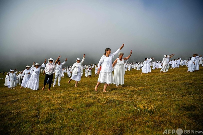 標高2100メートルにある「リラの七つ湖(Seven Rila Lakes)」周辺で、白い服を着た人々が、歌声とバイオリンの奏でる音楽に合わせ「パネウリスミー(paneurhythmy)」という瞑想(めいそう)的なダンスを1時間以上続ける。(c)AFP