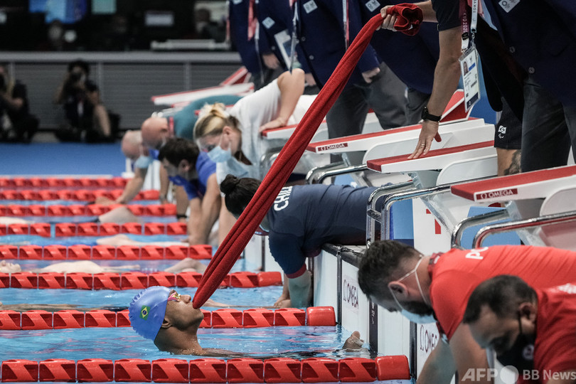 【8月31日 AFP】東京パラリンピック、競泳女子100メートル背泳ぎ(運動機能障害S2)予選で水を吐き出すメキシコのファビオラ・ラミレス(Fabiola Ramirez)。東京アクアティクスセンター(Tokyo Aquatics Centre)で。(c)AFP