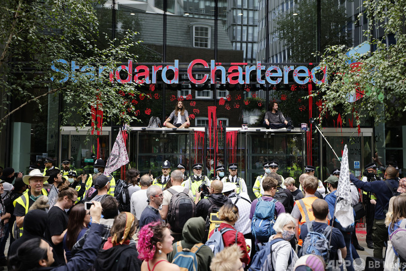 【8月28日 AFP】英ロンドンの金融街シティー(City)で27日、気候変動の危機を訴える団体「絶滅への反逆(Extinction Rebellion)」が抗議デモを行い、化石燃料産業向け融資の反対を訴えた。