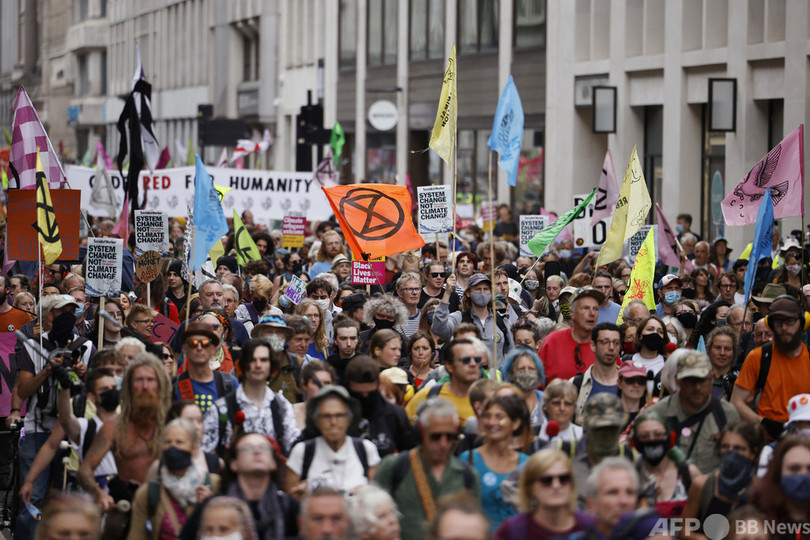 【8月28日 AFP】英ロンドンの金融街シティー(City)で27日、気候変動の危機を訴える団体「絶滅への反逆(Extinction Rebellion)」が抗議デモを行い、化石燃料産業向け融資の反対を訴えた。