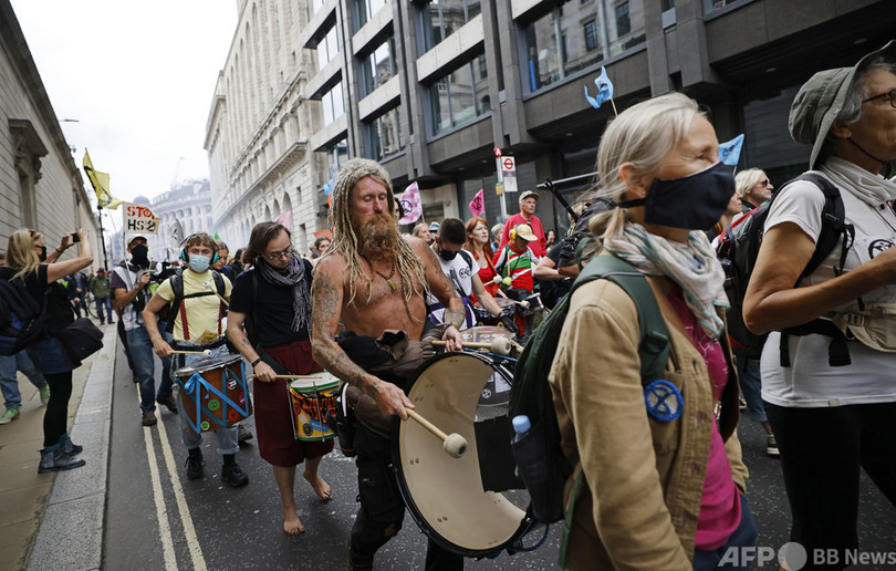 【8月28日 AFP】英ロンドンの金融街シティー(City)で27日、気候変動の危機を訴える団体「絶滅への反逆(Extinction Rebellion)」が抗議デモを行い、化石燃料産業向け融資の反対を訴えた。