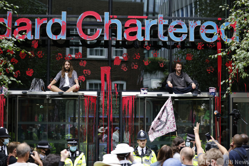 【8月28日 AFP】英ロンドンの金融街シティー(City)で27日、気候変動の危機を訴える団体「絶滅への反逆(Extinction Rebellion)」が抗議デモを行い、化石燃料産業向け融資の反対を訴えた。