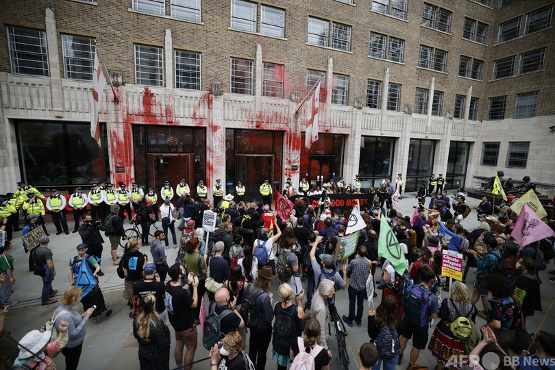 【8月28日 AFP】英ロンドンの金融街シティー(City)で27日、気候変動の危機を訴える団体「絶滅への反逆(Extinction Rebellion)」が抗議デモを行い、化石燃料産業向け融資の反対を訴えた。