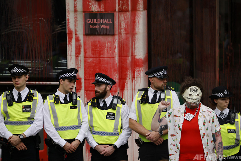 【8月28日 AFP】英ロンドンの金融街シティー(City)で27日、気候変動の危機を訴える団体「絶滅への反逆(Extinction Rebellion)」が抗議デモを行い、化石燃料産業向け融資の反対を訴えた。